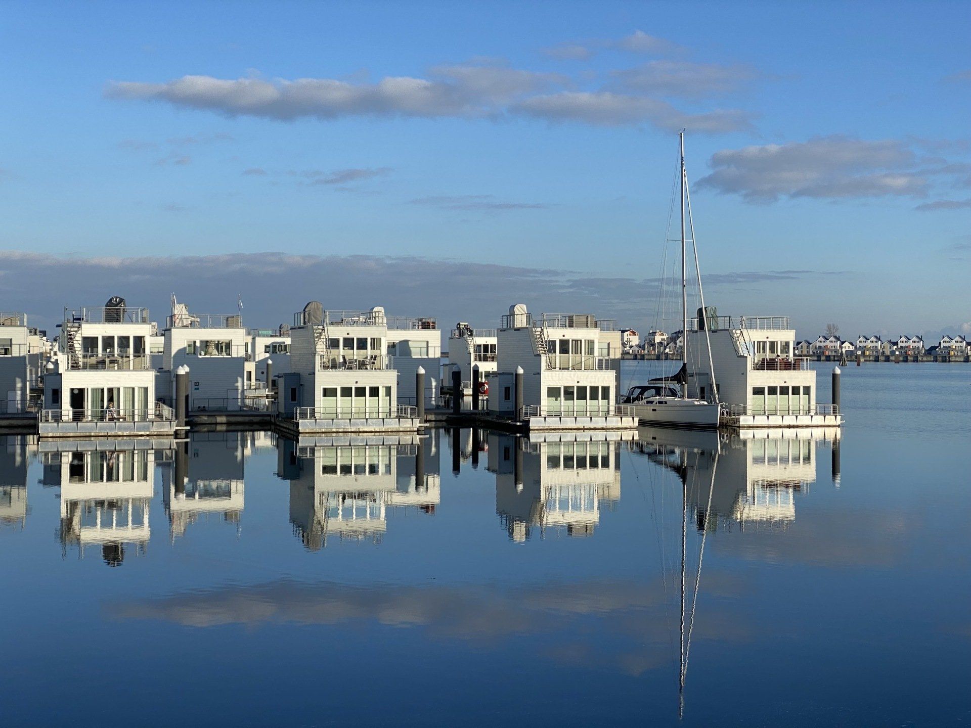 - Direkter Blick in den Hafen und die weißen Strandvillen